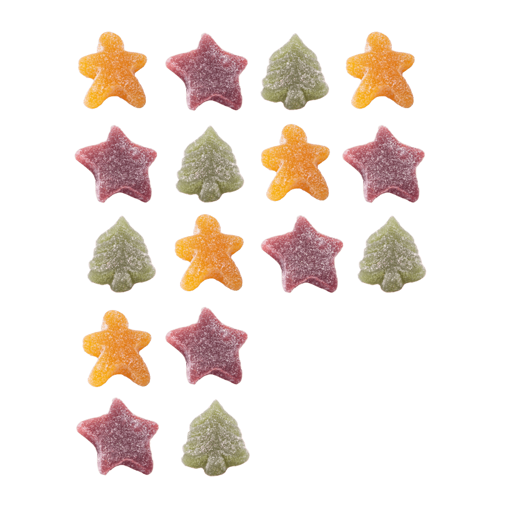 Sapin Poire/Bergamote : Purées de fruits 50% (poire 36%, bergamote 14%), sucre, sirop de glucose, pâte de bergamote confite 10% (bergamote, sucre, sirop de glucose), gélifiant : pectines, arôme naturel de poire, colorant : complexes cuivriques de chlorophyllines.